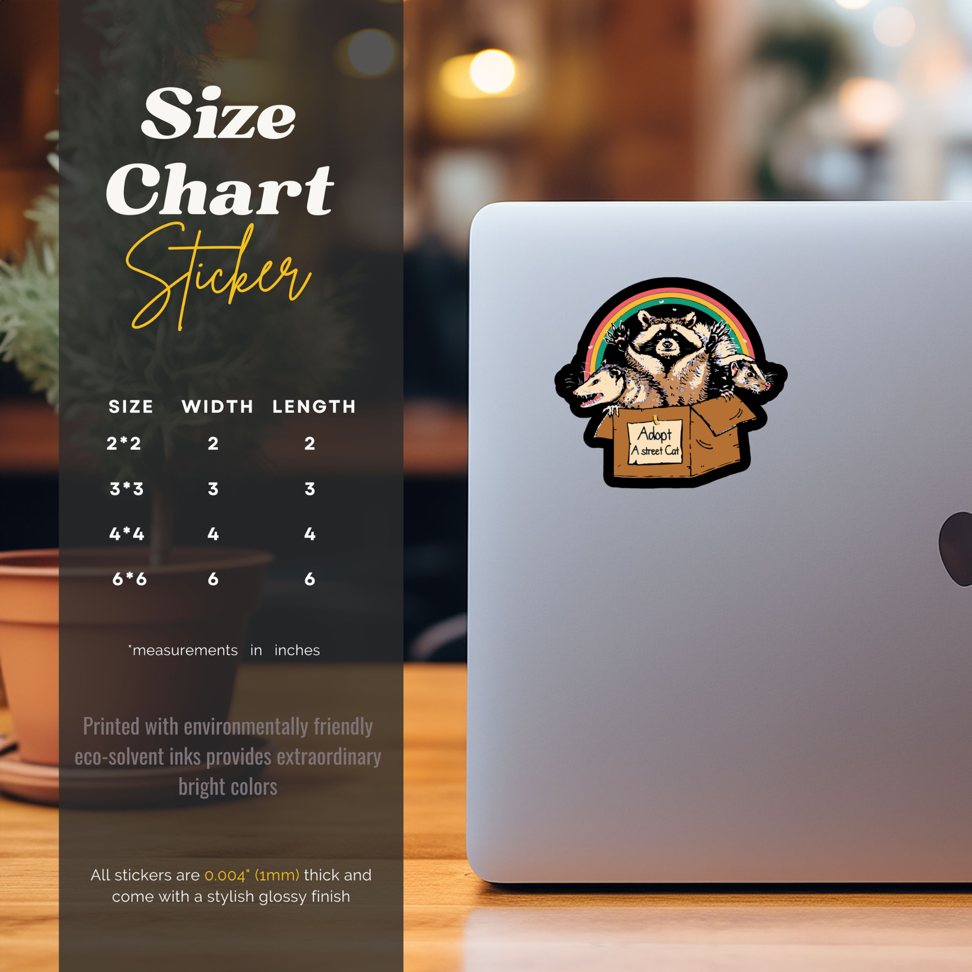 Show your support for animal rescue with this Adopt A Street Cat vinyl sticker featuring raccoon and opossum artwork with a rainbow backdrop.