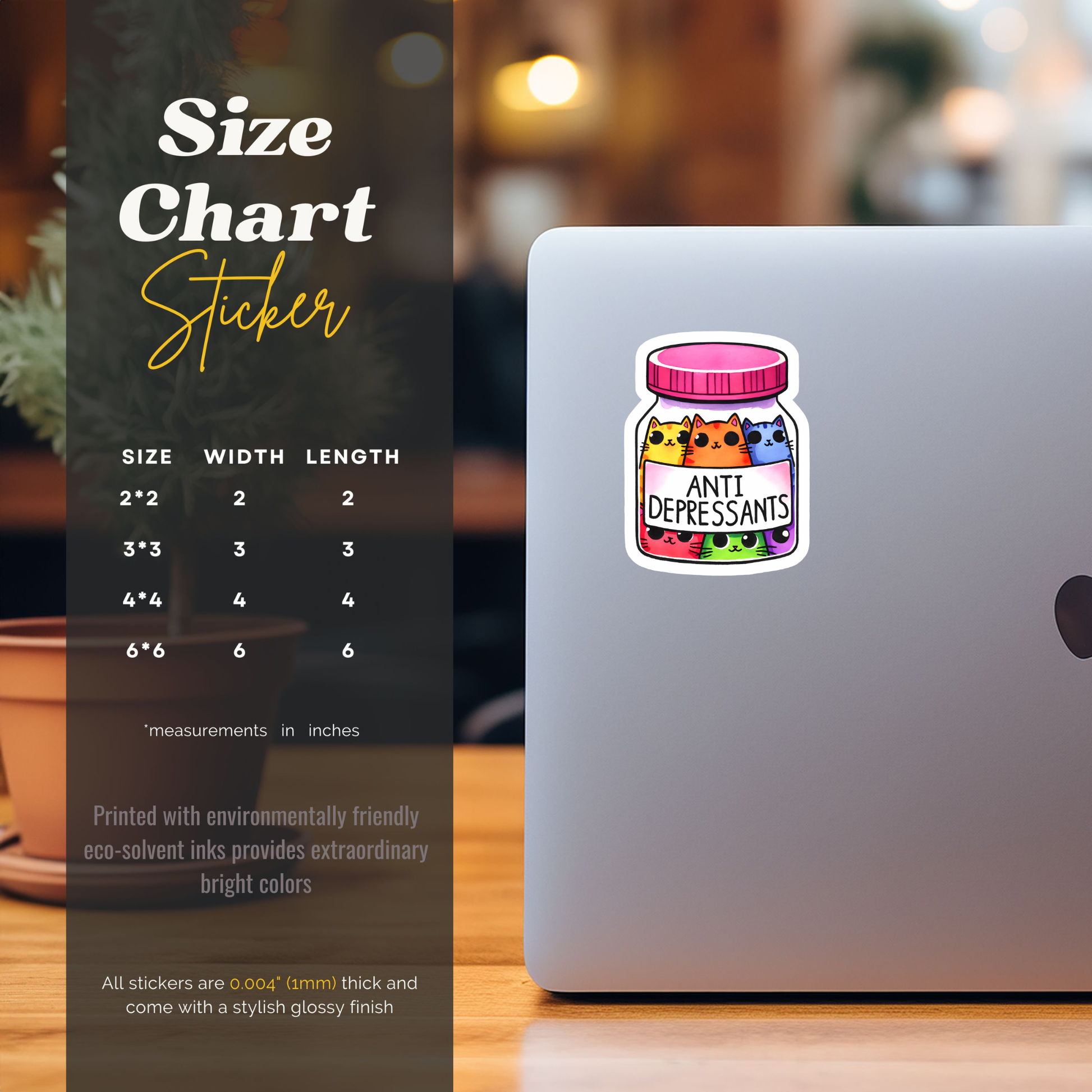 This vinyl sticker features a jar of colorful cats labeled “Anti Depressants.” Designed as a bold, graphic sticker for smooth surfaces and everyday items.